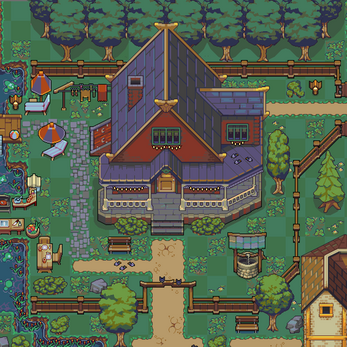 The package includes atlases with ground, water, farming , mining assets, some UI and objects on a grid of 32x32. You can see all the assets on the screenshots for the project. There are up to 8 gradations for the player's house progression.